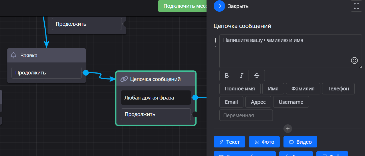 Добавьте блок «Цепочка сообщений» и напишите: «Пожалуйста, укажите вашу фамилию и имя».