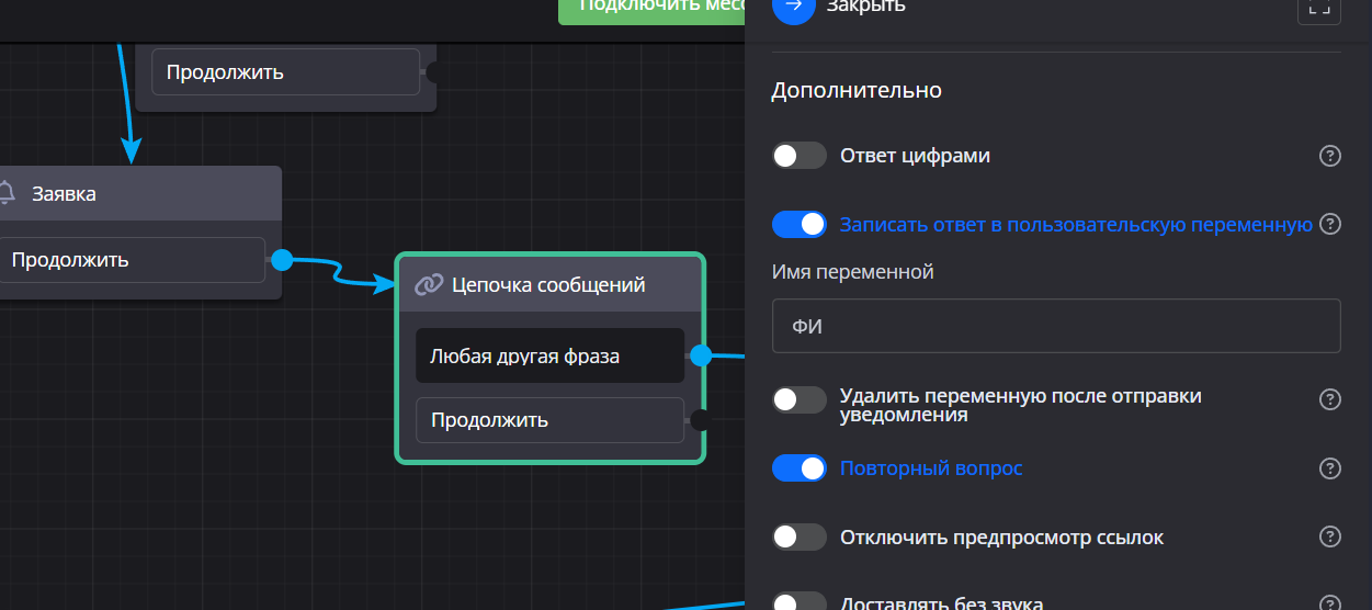 Дополнительные поля. Если вашему бизнесу нужно собирать больше информации (email, город, тип проблемы), просто добавьте дополнительные блоки между запросом телефона и описанием проблемы. Каждый ответ сохраняйте в отдельную пользовательскую переменную — все они передадутся в AmoCRM.