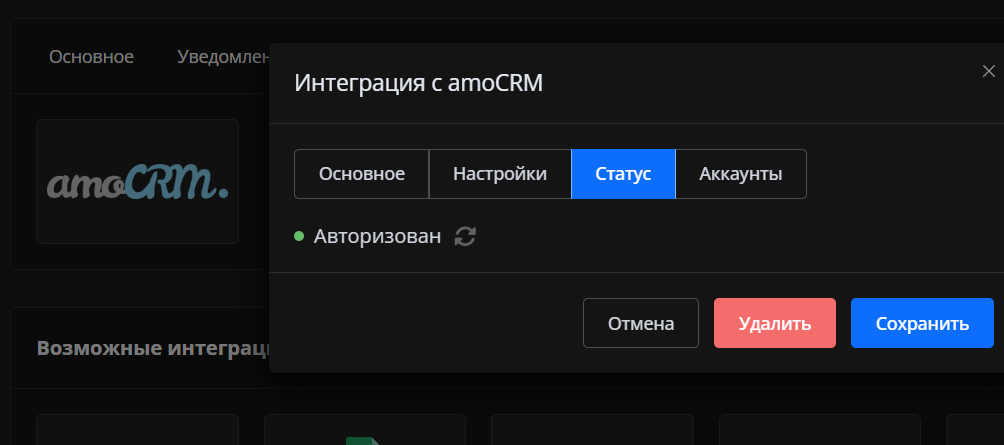 Обязательно вернитесь в раздел интеграций и убедитесь, что статус показывает «Авторизован». Если видите другой статус, попробуйте обновить подключение.