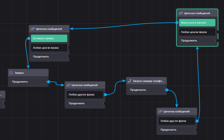 Добавьте кнопку «Вернуться в начало» — это даст пользователям возможность создать еще одну заявку, если понадобится. Проведите связь от этой кнопки к стартовому блоку, чтобы сценарий работал по кругу.