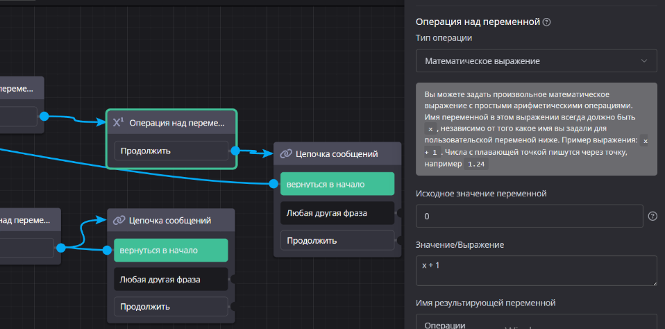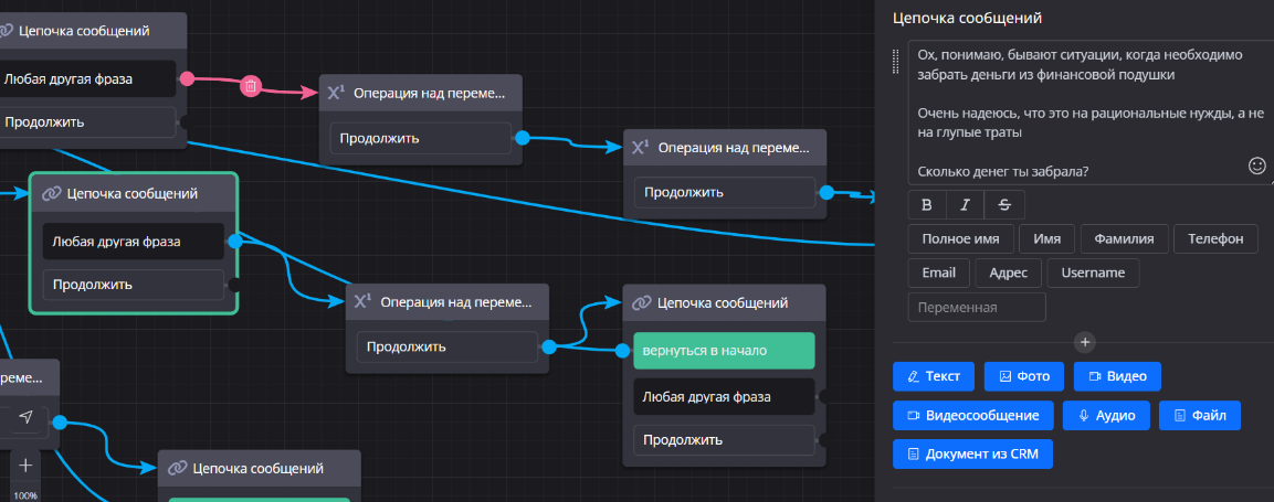 Создание связей между блоками: Связи отображаются синими стрелками и определяют логику работы бота. Чтобы создать связь:
