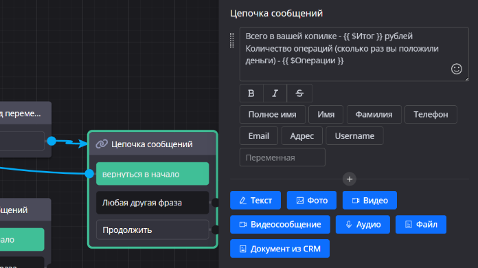 Добавьте блок "Цепочка сообщений" с вопросом: "Сколько денег хотите положить на счёт копилки?"