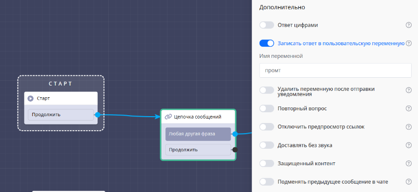 Включите опцию «Записать ответ в пользовательскую переменную».
