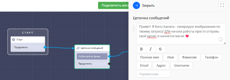 Проведите связь от стартового блока к блоку «Цепочка сообщений» (если связи нет).