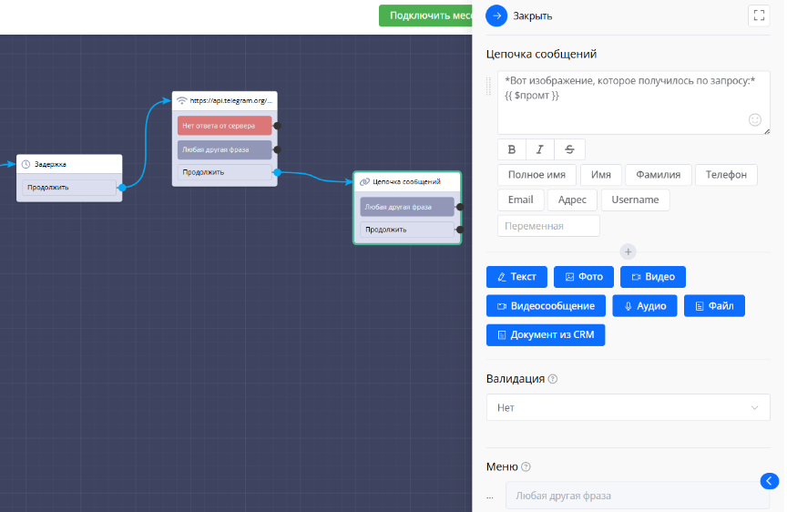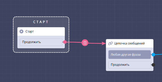 Проведите связь от перехода «Любая другая фраза» предыдущего блока к новому блоку «Цепочка сообщений».
