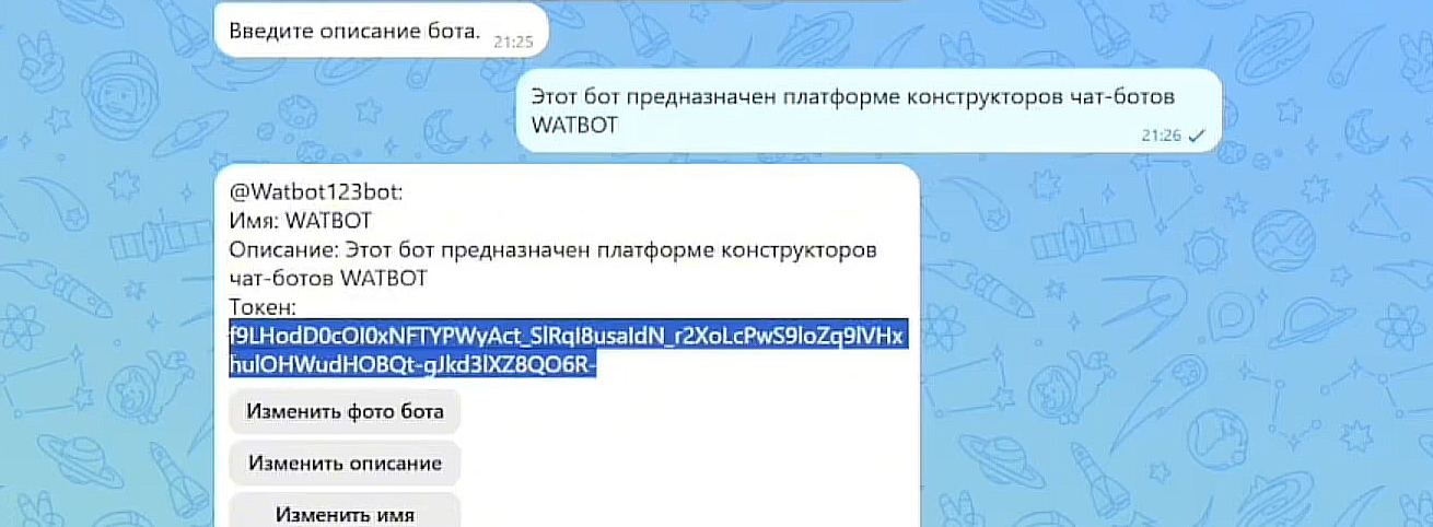 Обратите внимание: Все инструкции на русском языке, в отличие от BotFather в Telegram, где всё на английском.