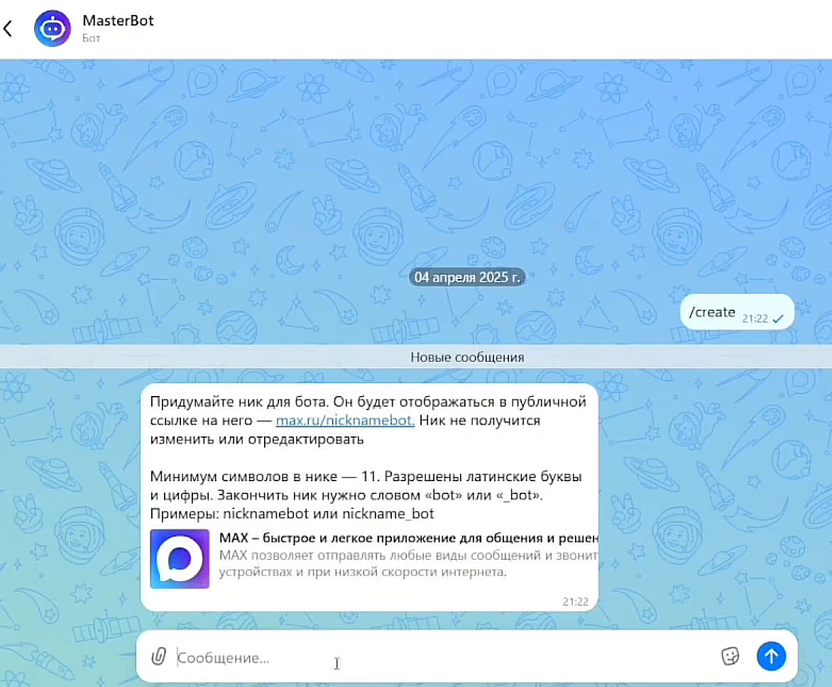 Важное отличие: В Telegram — /start, в MAX — /create для начала создания нового бота.
