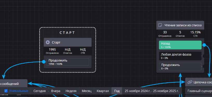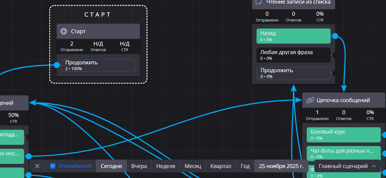 Важный момент: статистика привязана к конкретному сценарию. Если у вас несколько сценариев в боте (например, главный сценарий, сценарий оформления заказа, сценарий техподдержки), у каждого будет своя отдельная аналитика.