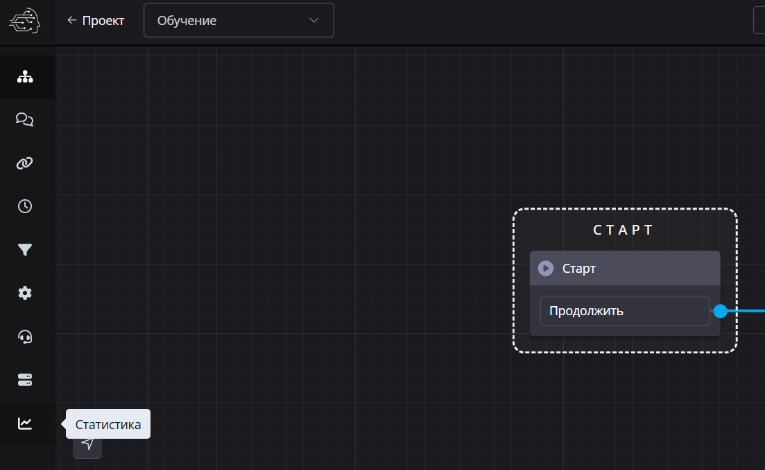 В левом меню платформы найдите раздел «Статистика» и перейдите в него. Здесь собраны данные по всему боту целиком, независимо от сценариев.
