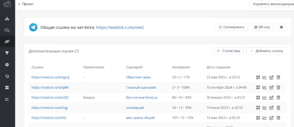 Один из самых мощных инструментов для маркетинговой аналитики — возможность создавать отдельные ссылки на чат-бота с индивидуальным трекингом.