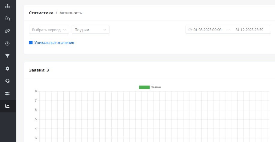 • Ежедневно (5 минут) — смотрите общие показатели: количество новых пользователей, заявок, аномальные всплески или провалы
