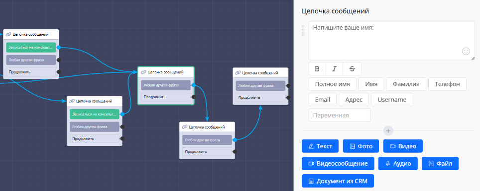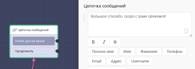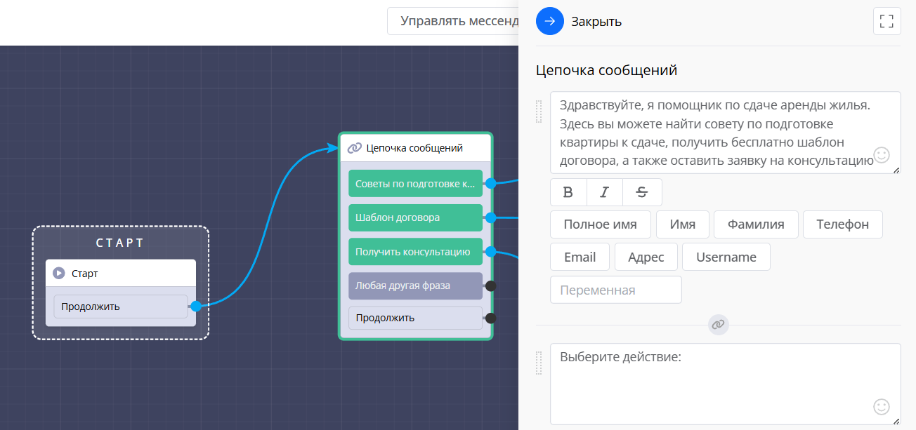 Записывать в переменные — сохранять ответы в пользовательские переменные и использовать их дальше по сценарию (например, обращаться к пользователю по имени).