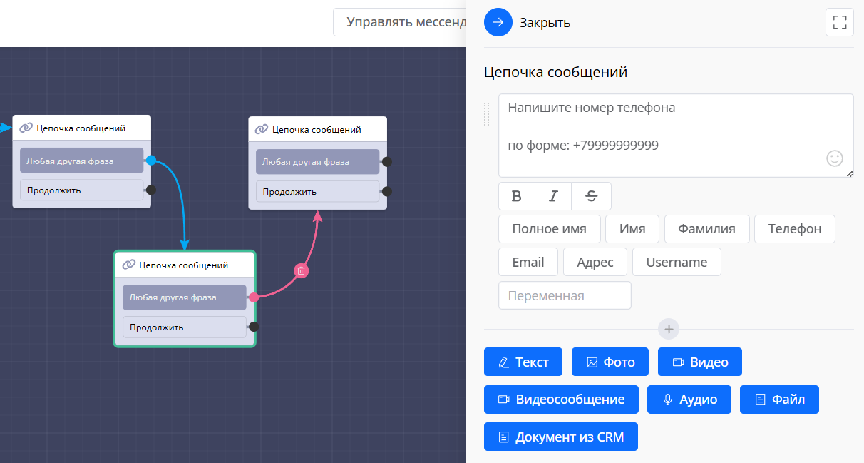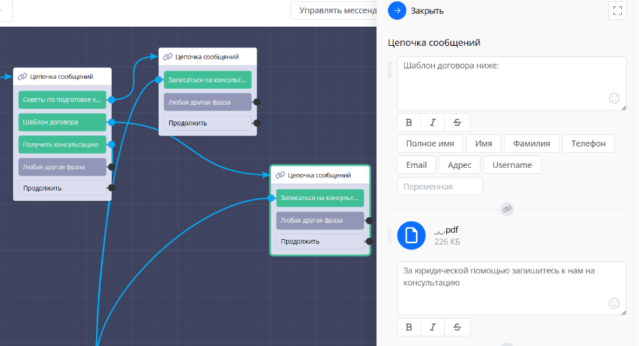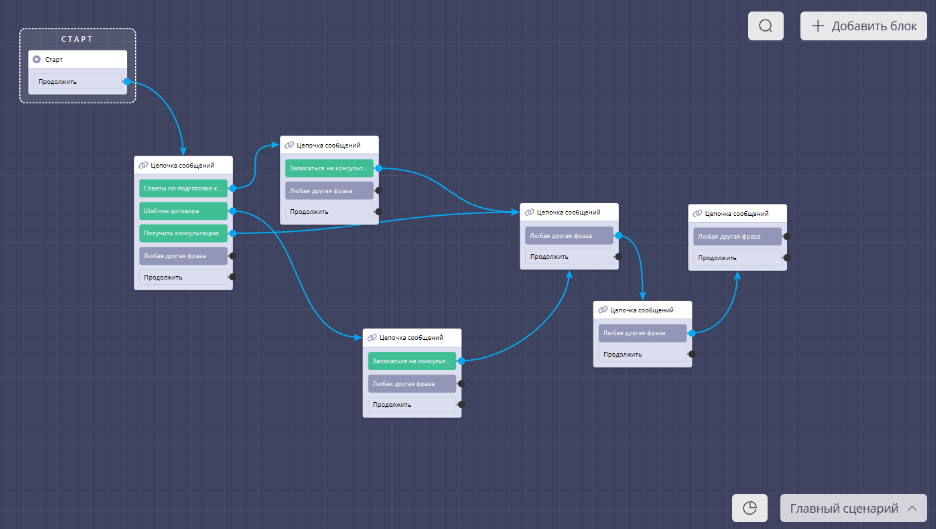 Связи показывают, как движется диалог. Они отображаются синими стрелками между блоками.