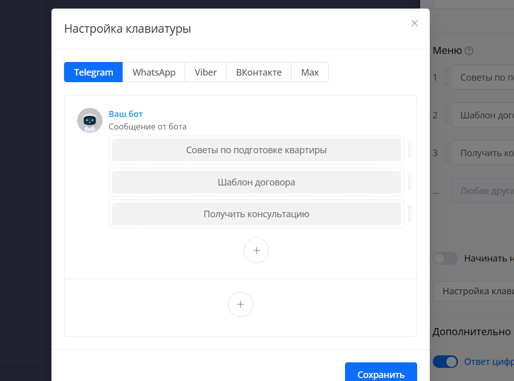 - Подключите мессенджер (Telegram, WhatsApp, VK)