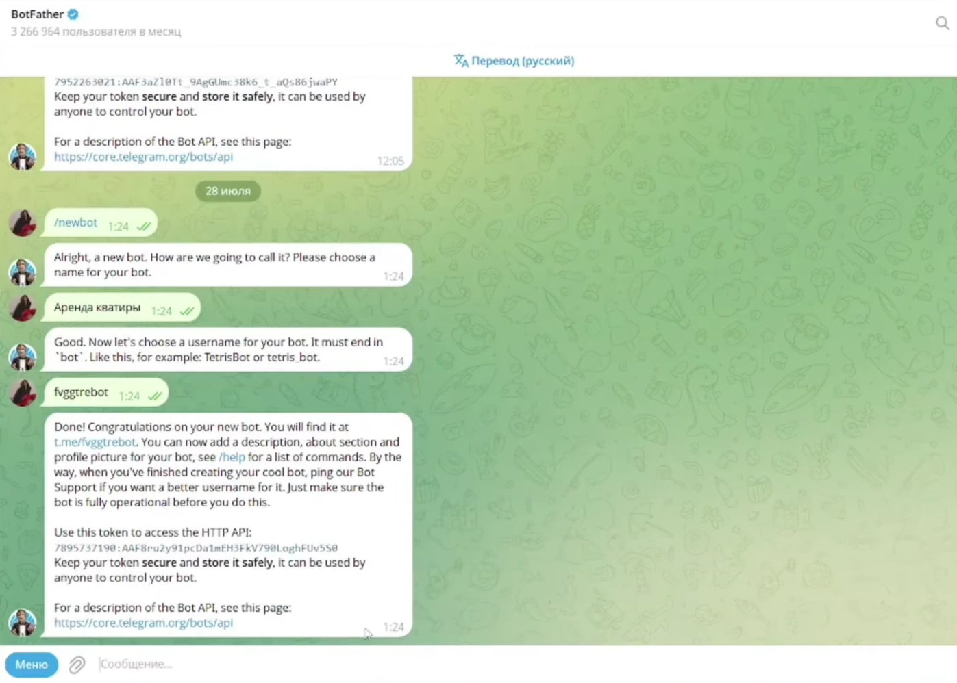 BotFather пришлет сообщение с поздравлением и API-токеном — длинной строкой вроде: