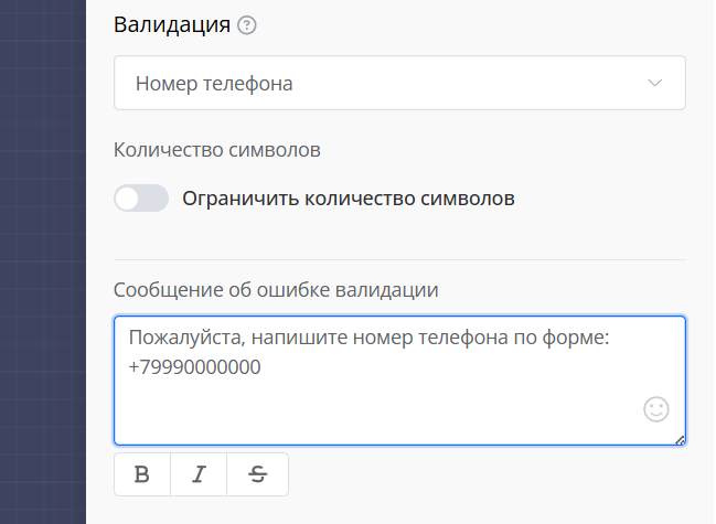 Приходит: «Напишите номер телефона: Пример: +7 912 345-67-89»