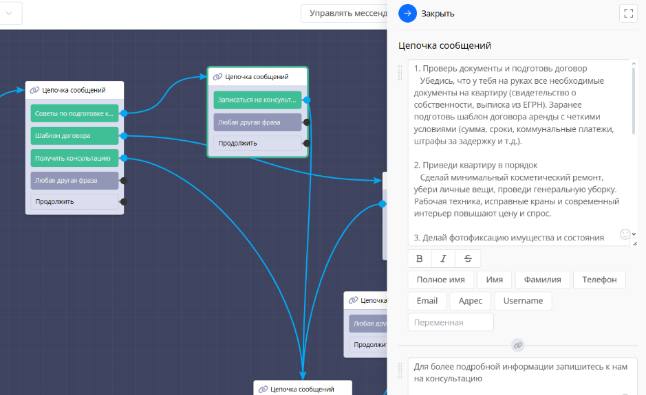 Поздравляю! Вы создали своего первого чат-бота — функционального помощника по аренде квартир. Он умеет давать советы, отправлять документы и принимать заявки.
