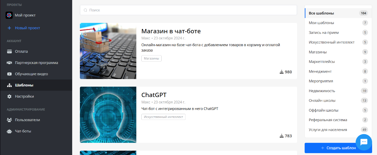 На данный момент доступно 104 готовых шаблона для разных ниш и задач: