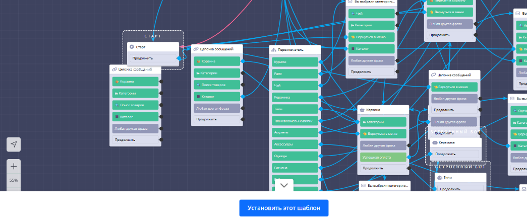 Давайте посмотрим на примере. Откроем шаблон «Магазин в чат-боте».